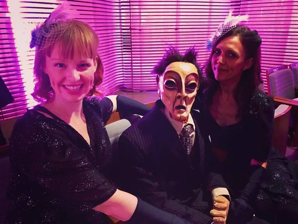 So Voix de Ville was a blast. A photo of Alexa Fraser, me, and poor Dante-the-Puppet as we wait to perform The Enormous Elsewhere's Magic Show of Mishaps.